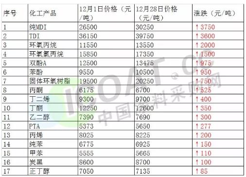 預計此次石油價格的上調,會引起相關化工產品的價格波動。據中國涂料采購網信息中心統計,過去的一個月化工產品漲得最多的是純MDI,上漲3750元/噸;排名第二的是TDI,上漲3600元/噸;漲幅排第三的是環氧丙烷,上漲2000元/噸;排名第四的是環氧氯丙烷,上漲1500元/噸。環氧樹脂原材料雙酚A上漲975元/噸。與石油緊密關聯原材料,丁二烯上漲400元/噸,丙烯上漲200元/噸。其他產品丙烯、純苯、甲苯、炭黑等都有一定程度的上漲。