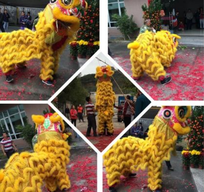 廣州真柔美涂料有限公司請舞獅團前來慶祝開工大吉。鑼鼓聲中,舞獅表演者自由跳躍,獅身上下翻騰,動作剛勁,神態多變,駐足觀看的路人送上陣陣歡呼和掌聲。舞獅過程中,財神爺人偶和狗年吉祥物人偶與路人頻頻互動,向大家傳遞新年好運氣。