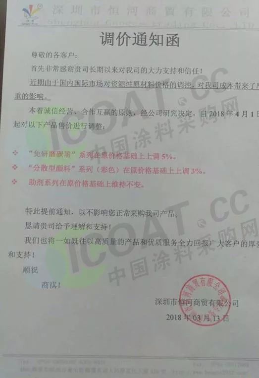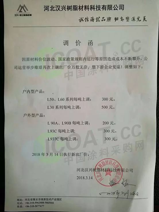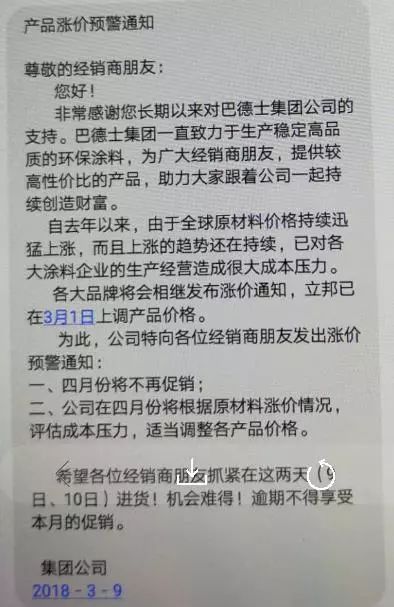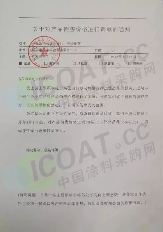中國涂料采購網最新消息,3月9日巴德士發布產品漲價預警通知,繼廣東涂料企業漲價消息發布之后 ,展辰集團于3月13日率先發布“關于對產品銷售價格進行調整的通知”,宣布4月1日起對產品銷售價格上調5%以上(部分品種上調10%以上)。