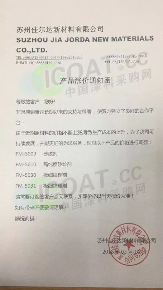 艾仕得宣布將對其在大中國區銷售的涂料產品價格上調5-10%。涉及到的價格調整產品包括部分修補漆、工業涂料和交通運輸涂料。價格調整將于2018年4月1日起生效。