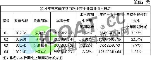 【中國涂料采購網(wǎng)】繼“2014年第三季度涂料上市企業(yè)發(fā)展分析”發(fā)布之后,我們對(duì)涂料上市企業(yè)及涂料行業(yè)的發(fā)展有基本的了解,然而涂料的利潤空間一方面受制于下游市場的需求,另一方面則受制于上游產(chǎn)品的市場價(jià)格走勢,在涂料的生產(chǎn)過程中,鈦白粉占有很大比例。換言之,鈦白粉市場的發(fā)展對(duì)涂料行業(yè)及企業(yè)的發(fā)展都有很大的影響,因此,我們將通過營業(yè)收入、凈利潤、負(fù)債率三方面的情況,了解鈦白粉上市企業(yè)的發(fā)展現(xiàn)狀及鈦白粉行業(yè)的發(fā)展。