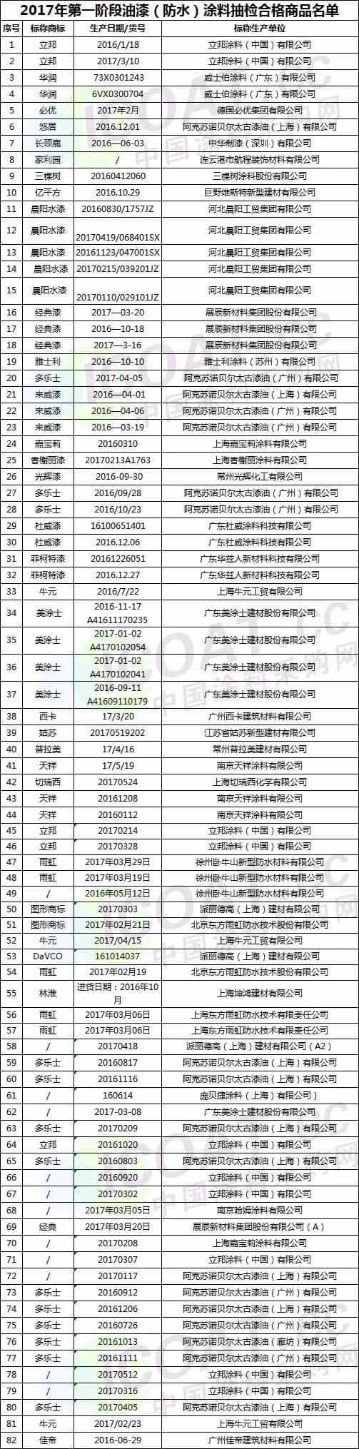 2017年第一階段油漆(防水)涂料抽檢合格名單