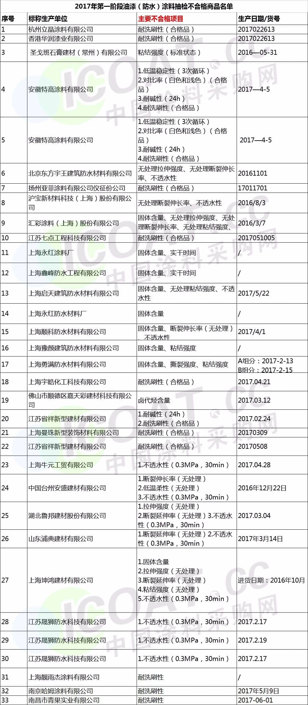 江蘇省2017年第一階段部分油漆(防水)涂料抽檢不合格商品名單