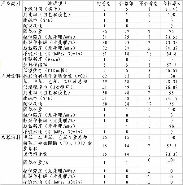撕裂強(qiáng)度是涂料性能的一個重要指標(biāo)。此次抽檢的涂料中有1組不合格。