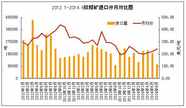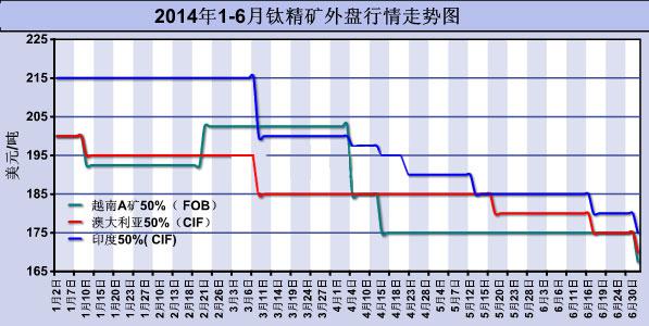 價格的發展往往受到下游市場需求及上游原材料價格走勢來決定的。自2011年下半年以來,國內鈦白粉市場價格處于低位運行狀態,對國內鈦精礦產品的價格也造成了很大的影響。從下圖我們可以看出,自2014年以來,全球鈦精礦市場價格出現下滑,以越南為例,從2014年1月份200美元/噸下滑到6月30日的167美元/噸左右,每噸下滑近30美元。