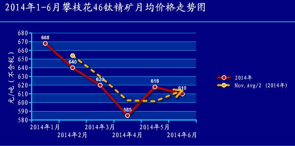 2014年上半年國際鈦精礦市場價格的下滑,影響了國內鈦精礦市場價格的走勢,據中國涂料采購網了解,自2014年1月至2014年4月,國內鈦精礦市場價格出現大幅跳水,以攀枝花46鈦精礦為例,從下圖我們可以看出,國內攀枝花46鈦精礦市場價格從1月668元/噸(不含稅)降至4月份的585元/噸,下滑幅度達83元/噸。5月份國內鈦精礦市場價格迎來一次小漲,調漲至618元/噸,上漲33元/噸,較2014年1月份,仍處于下滑態勢。