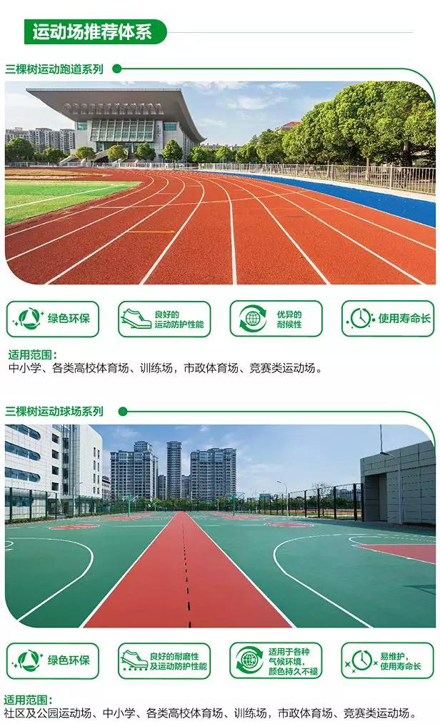 為了孩子們的健康成長,三棵樹推出了綠色校園健康運動場涂裝系統,運用環保型材料進行跑道鋪設,為孩子們提供安全無污染的健康運動場。