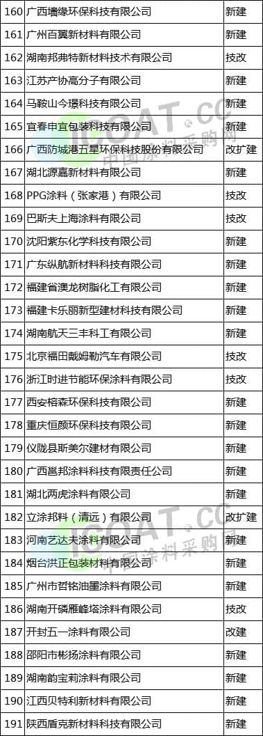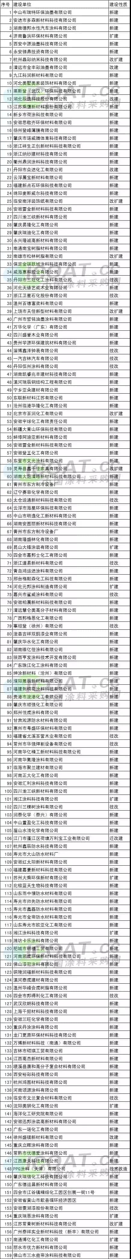 2018年1月~11月部分水性涂料及原材料建設項目