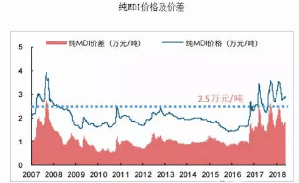 事實如何呢?事實是十年前的2008年萬華合并凈利潤為17.58億元,至2017年末實現合并凈利潤133.09億元,為十年前的7.57倍;十年間股價從月均4.73元漲至如今的30元附近,上漲了約6倍。近十年平均ROE為26%,屬于A股的一流水準。而在此期間,MDI價格從2萬元/噸開始波動,先后經歷了兩次周期輪回,目前仍然處在2萬元/噸的價格附近。顯然,萬華的業績和股價突破了周期的輪回。