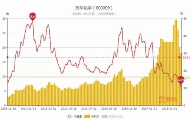 另一方面,周期股也并非就意味著不好,并非沒有投資價值,實際上周期股上下劇烈波動的股價也帶來了獨特的投機性,美國投資大師彼得林奇在《彼得林奇的成功投資》中說到,周期股要在“高市盈率買進,低市盈率賣出”。所謂周期股的市盈率陷阱,在萬華身上有沒有呢?看下圖: