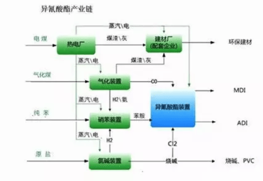 以萬華年報上的異氰酸酯產業鏈為例,MDI的生產以苯胺為重要原料,苯胺的合成又需要氫氣,于是引入氯堿裝置,該裝置運行過程中產生的氫氣可以輔助合成苯胺,這就降低了生產MDI時獲得氫氣的成本,同時氯堿裝置又生產出終端產品PVC,這就使PVC產品線和MDI產品線同時獲得了成本優勢,這樣的協同效應還有很多例子。
