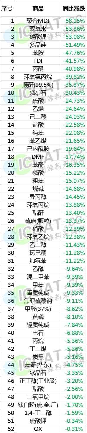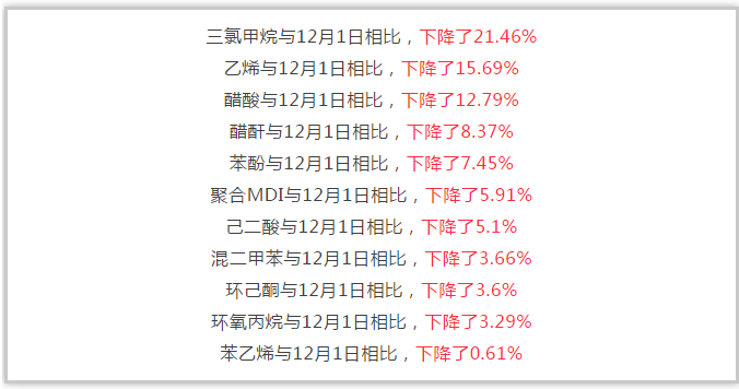 與國外化工企業形成顯明對比的是,國內原材料價格出現大幅度下滑,如:
