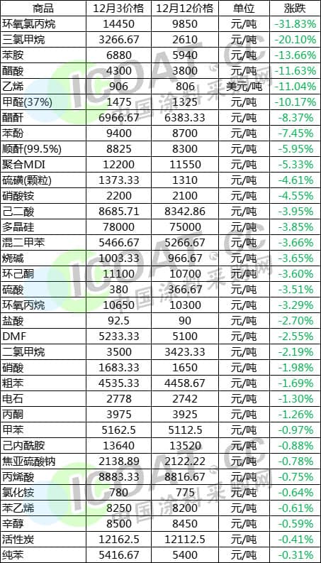 近半個月的時間以為,國內大部分原材料產品價格都出現不同程度的下跌,部分原材料價格下滑情況如下表所示:
