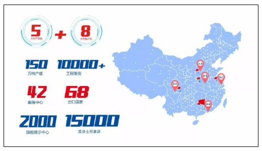 產品銷往全國各地及東南亞、歐美等68個國家和地區(qū),連續(xù)多年出口額位于中國涂料行業(yè)第一名;旗艦展示中心2000家,形象店近15000個,遍布于全國各省、市、自治區(qū)及港澳臺地區(qū)。在全國專設42個服務中心,業(yè)內獨創(chuàng)系統化、標準化、高效反應的服務體系。