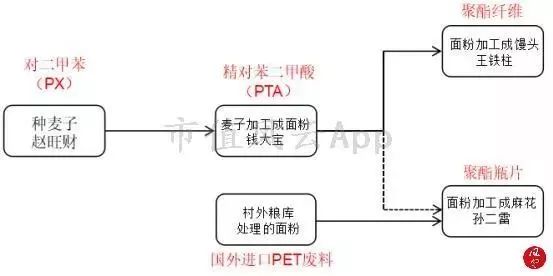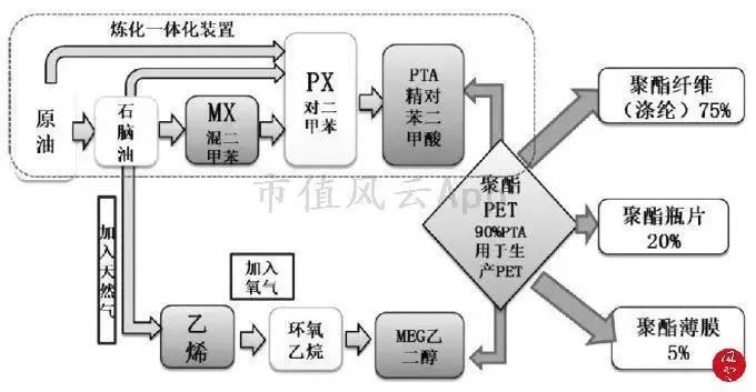 PTA的主要需求是滌綸(聚酯纖維),約占到PTA總需求的75%,其次是聚酯瓶片約占到20%,這個(gè)產(chǎn)業(yè)鏈流程圖如下: