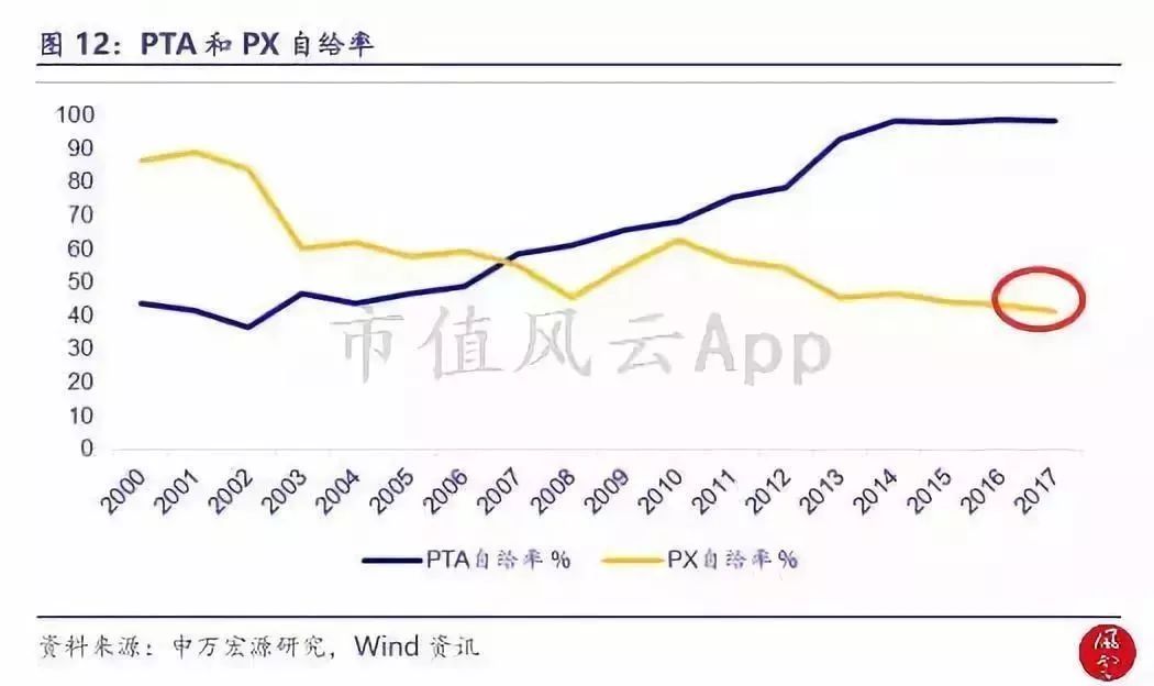PX、PTA自給率變動(dòng)情況見(jiàn)下圖: