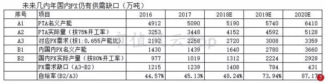 (來(lái)源:PTA的2016年開(kāi)工率66%,2017年開(kāi)工率68%;其他數(shù)據(jù)來(lái)源中纖網(wǎng),國(guó)金證券研究所等,PX新增產(chǎn)能只統(tǒng)計(jì)確定性高的產(chǎn)能,2019年后PX產(chǎn)量中包括文萊項(xiàng)目的名義150萬(wàn)噸,特別說(shuō)明:本統(tǒng)計(jì)數(shù)據(jù)或與其他機(jī)構(gòu)發(fā)布數(shù)據(jù)存在一定出入。)