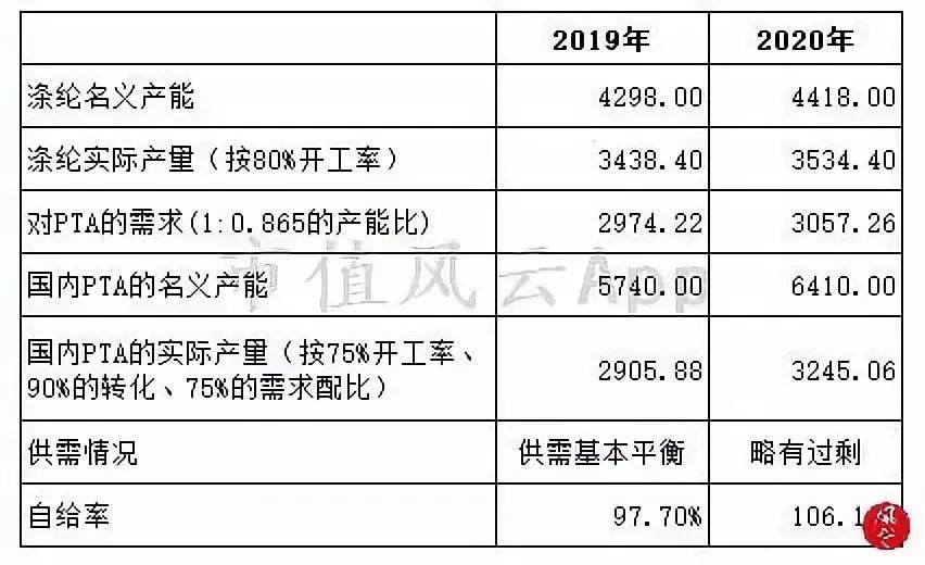 通過(guò)測(cè)算下游的滌綸產(chǎn)能進(jìn)而推算未來(lái)兩年P(guān)TA-滌綸的或供需維持基本平衡的狀態(tài),見(jiàn)下表: