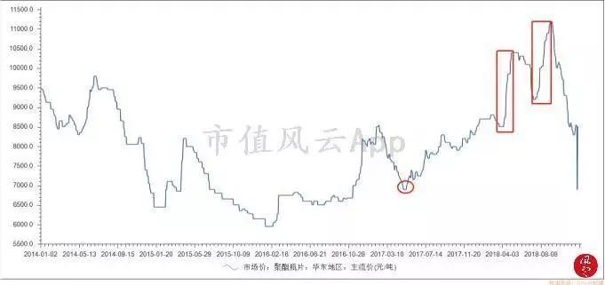 2017年5月份聚酯瓶片的價(jià)格創(chuàng)下2年的低點(diǎn)7100元/噸后,隨即一路震蕩上漲,2018年4月從8500元/噸在半個(gè)月內(nèi)飆漲到9500元/噸(4月27日),漲幅超過(guò)15%,隨后在9月10日又一度上漲到11200元/噸。