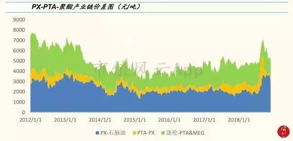 (來(lái)源:Wind,備注,PX價(jià)差=1噸PX價(jià)格-1噸石腦油價(jià)格,PTA價(jià)差=1噸PTA價(jià)格-0.66噸PX價(jià)格,聚酯價(jià)差=1噸POY價(jià)格-0.855噸PTA價(jià)格-0.355MEG價(jià)格)