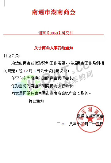 據(jù)涂料采購(gòu)網(wǎng)消息,昨日(12月23日)南通市湖南商會(huì)發(fā)布《關(guān)于商會(huì)人事變動(dòng)的通知》稱(chēng),為適應(yīng)商會(huì)發(fā)展形勢(shì)和工作需要,根據(jù)商會(huì)工作條例相關(guān)規(guī)定,經(jīng)12月5日會(huì)長(zhǎng)討論與決議: