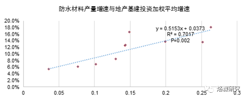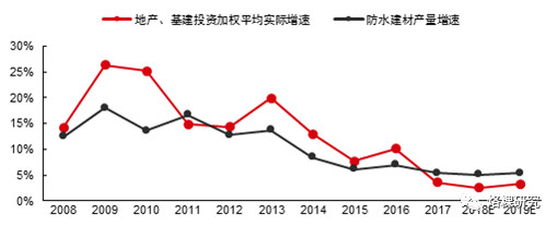 需求未來三年CAGR5.4%。通過對過去10年的數據進行分析,我們發現防水材料產量增速與價格調整后的地產、基建投資加權平均增速存在線性相關關系,擬合度可以達到0.7且顯著。通過這一相關關系,結合我們對未來地產、基建投資的預測,即可推算未來防水材料需求增速?;谖覈ㄖI投資放緩的大方向,我們假設未來三年剔除價格因素后的實際地產、基建投資增速為3%、4%,據此估算未來三年防水材料市場規模CAGR為5.4%。