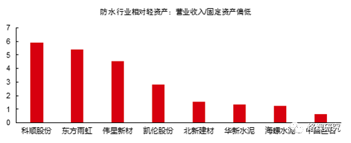 低端防水具有低門檻、輕資產特點。目前國內防水材料企業數量龐大,只有少部分企業具有較高的技術水平和產品質量,大部分企業規模較小、技術落后、產品質量不達標。這是由于低端防水產品技術門檻不高,同時防水產品生產設備投資額相對較低,導致在行業發展初期大量小企業進入。2017年規模以上防水材料企業營業收入1059.4億元,利潤總額71.8億元。三家上市公司東方雨虹、科順股份、凱倫股份2017年主營業務收入合計127.26億元,利潤總額17.5億元,分別僅占規模以上企業相應指標的12.0%和24.4%。由于非規模以上企業數量龐大,若考慮防水材料整體市場,則集中度指標會更低。