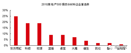 地產集中度提升有利于防水龍頭企業份額擴大。2017年前十大房地產商銷售額占行業銷售額的24.16%,近5年來該比例持續上升。房地產行業呈現逐漸向頭部企業集中趨勢,大地產商的集中采購和戰略合作成為主流,更傾向于向大型防水供應商采購。原因在于:(1)商品房漏水對地產商品牌形象影響較大,漏水風險應盡可能降低;(2)防水成本占比不高;(3)大地產商看重供應商的全國性供應能力和資金實力。