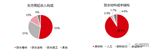 東方雨虹的核心競爭力。防水產品成本結構最大的特點是原材料成本占比90%,要做到效率最優就必須在原材料成本上下功夫,因此產品配方和規模經濟十分重要。配方是平衡產品品質和成本的核心,規模經濟則體現在采購上。此外公司在管理、渠道機制、施工服務、產能布局等方面具備顯著競爭優勢,以上是公司在國內中高端防水領域獲得巨大領先優勢的原因。