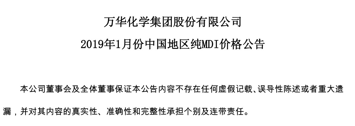同日,萬華化學發布消息稱,自2019年1月份開始,萬華化學集團股份有限公司中國地區純MDI掛牌價23700元/噸(比2018年12月份價格下調700元/噸),聚合MDI掛牌價請參見公司于2018年12月27日發布的臨2018-152號公告。