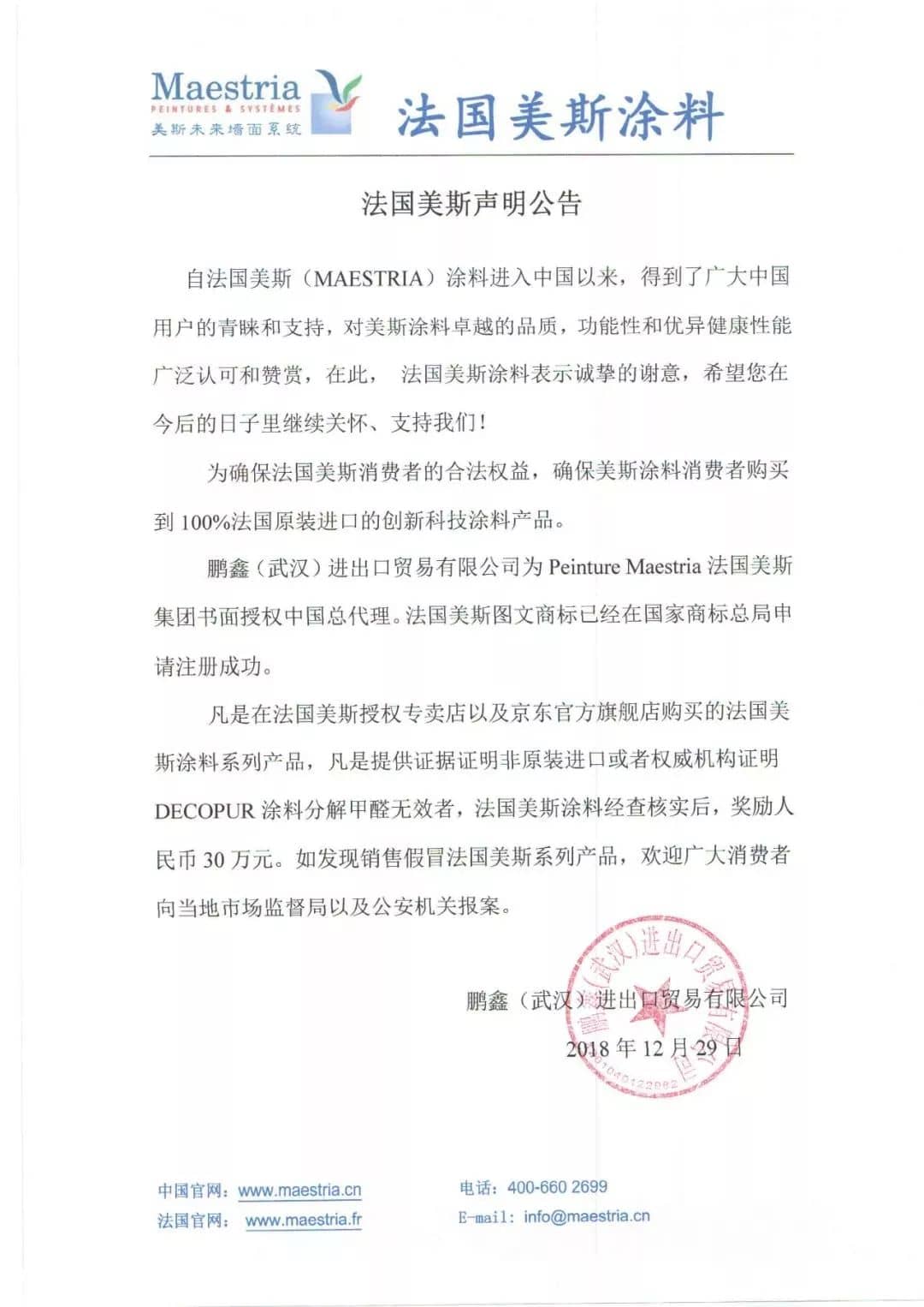 為確保法國美斯消費者的合法權益,確保美斯涂料消費者購買到100%法國原裝進口的創新科技涂料產品。