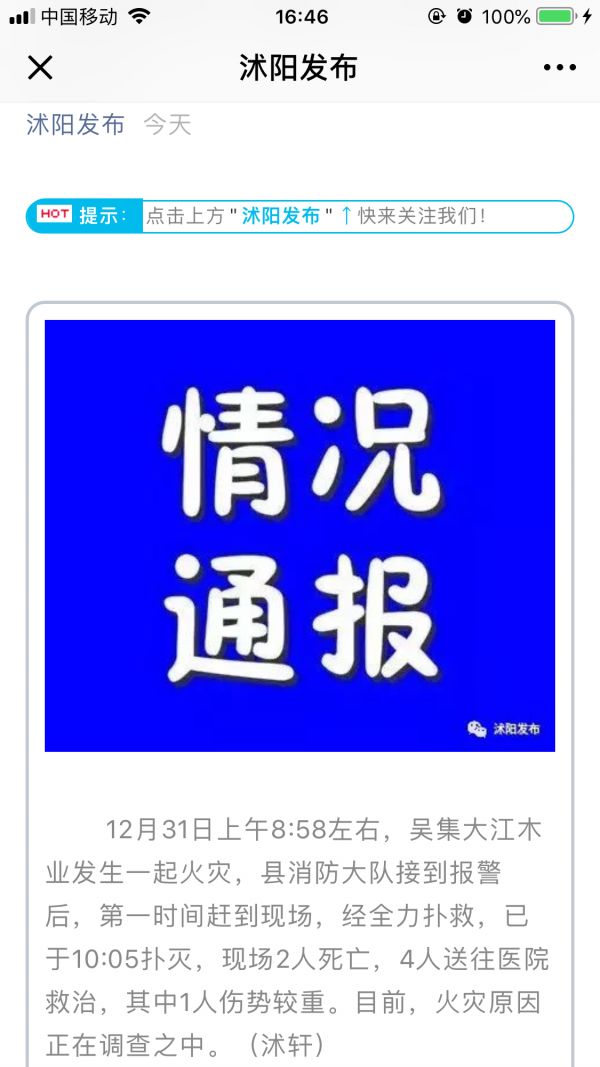 12月31日上午8點58分左右,江蘇宿遷市沭陽縣吳集鎮(zhèn)“大江木業(yè)”發(fā)生一起火災(zāi)。沭陽縣委宣傳部通報稱,當(dāng)?shù)叵来箨牻拥綀缶筅s到現(xiàn)場,經(jīng)全力撲救,火情于10點05分撲滅,現(xiàn)場2人死亡,4人送往醫(yī)院救治,其中1人傷勢較重。目前,火災(zāi)原因正在調(diào)查之中。