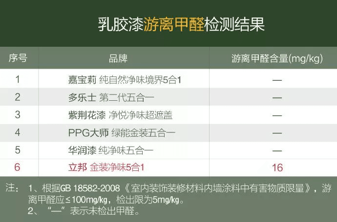 檢測結果顯示,多款乳膠漆的游離甲醛含量都符合國家標準。僅立邦檢出了游離甲醛,其含量為16mg/kg,滿足國家標準的規定但高于某些歐盟標準或認證的限量數值。