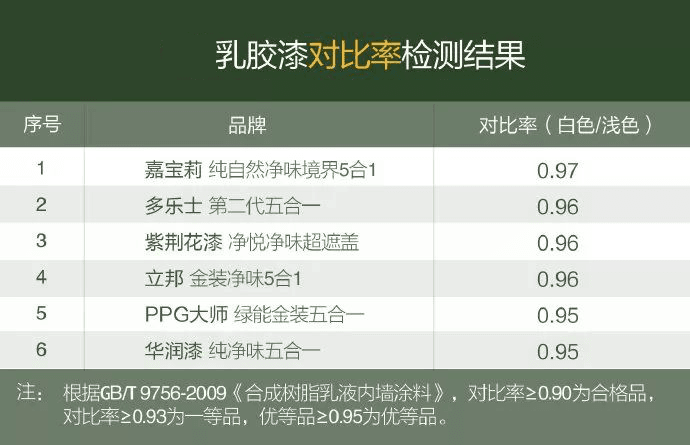 綜合安全方面的游離甲醛、苯類指標,性能方面的對比率、耐洗刷性指標,《消費者報道》得出多款乳膠漆的綜合評價。