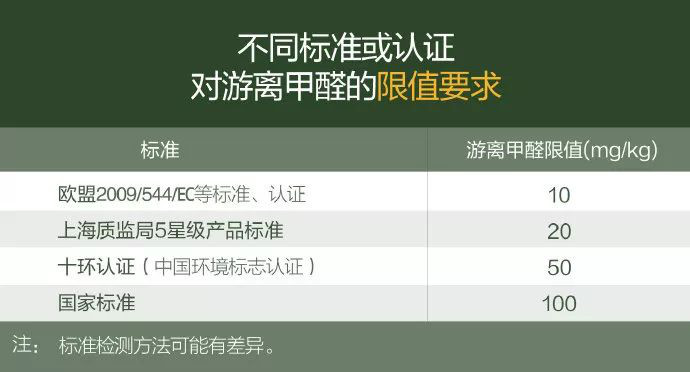 歐盟 2009/544/EC指令、德國藍天使認證、美國EPA、CARB等標準或認證,甚至將游離甲醛的含量提高到了10mg/kg限值,是國標的1/10。
