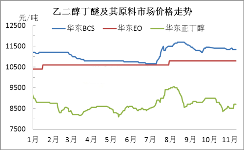 今年以來,雙原料環氧乙烷、正丁醇價格震蕩運行。由圖2可知,乙二醇丁醚價格走勢與正丁醇價格波動較為相近,說明正丁醇對乙二醇丁醚價格影響較大。近期油價暴跌,部分化工產品隨之下行,然正丁醇因部分廠商裝置停車,社會整體供應能力偏低,因此油價狂跌時,市場并沒有緊跟跌勢,11月份因裝置檢修等利好提振,價格呈上行趨勢。另一原料環氧乙烷,行情持續低迷,跌價傳聞釋放已久,遲遲不見實際下調跡象,成本支撐下,目前乙二醇丁醚市場暫僵持運行。然多數業者對原料后期持悲觀預期,國外生產廠商產銷承壓,外盤已窄幅下調,后續仍有回調空間,因此年末國內外成本面均顯弱勢,加劇乙二醇丁醚市場看空氣氛。