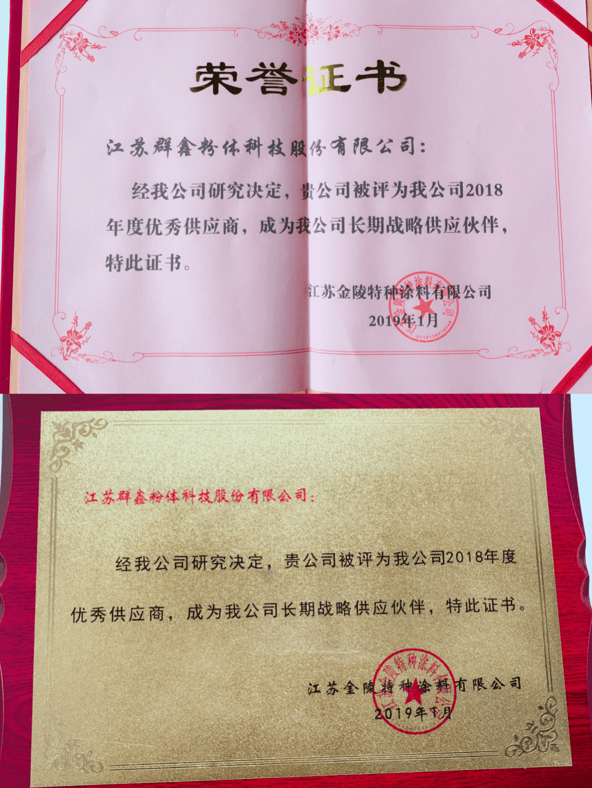 會上,江蘇群鑫粉體科技股份有限公司憑借優質的服務,卓越的產品,榮獲了江蘇金陵特種涂料有限公司“2018年度優秀供應商”殊榮,此殊榮也標志著群鑫公司在持續提升客戶滿意度上再上新臺階,不僅鞏固了群鑫公司與金陵涂料的合作關系,也為兩家公司未來進一步的共同開發,緊密合作奠定了堅實的基礎!