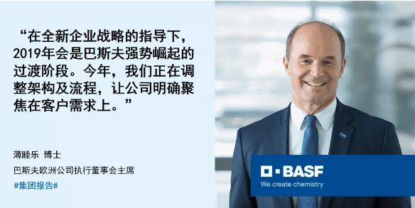 北京時間2月26日,巴斯夫歐洲公司執行董事會主席薄睦樂博士(Dr. Martin Brudermueller)和首席財務官Hans-Ulrich Engel博士共同公布了2018年財務數據。薄睦樂表示:“我們正積極應對這些挑戰。在全新企業戰略的指導下,2019年會是我們強勢崛起的過渡階段。今年,我們正在調整架構及流程,讓公司明確聚焦在客戶需求上。”