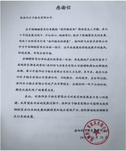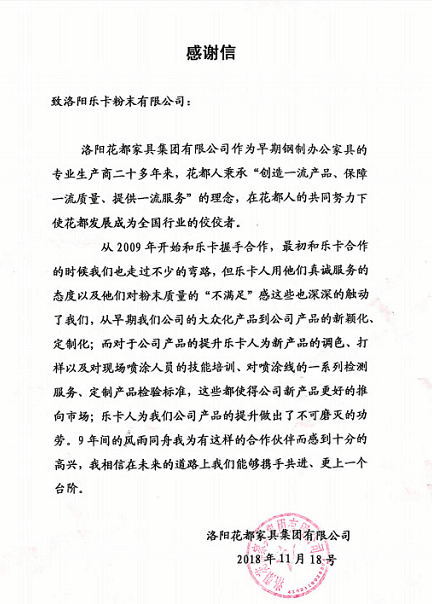 對于一家企業來說,最大的成就莫過于用戶的認可,近日,洛陽樂卡粉末有限公司(以下簡稱“樂卡”)收到了來自洛陽科飛亞家具有限公司(以下簡稱“科飛亞家具”)和洛陽花都家具集團有限公司(以下簡稱“花都家具”)的兩封感謝信,對樂卡在這些年來為客戶提供優質的產品和更優質服務給予了高度認可。