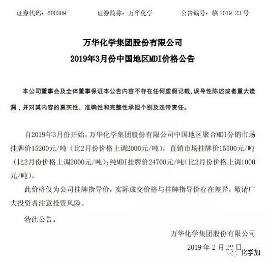 而在此前的1月30日,萬華化學(xué)就宣布,將2月份中國(guó)地區(qū)聚合MDI分銷市場(chǎng)的掛牌價(jià)與直銷掛牌價(jià)格均比1月份價(jià)格上調(diào)700元/噸。
