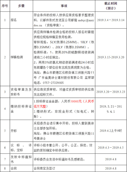6.供應商樣桶未檢測合格的投標報名時需要提供相應規格樣桶至我司監察部檢測,地址:佛山市順德區倫教街道三洲振興路11號美涂士監察部。