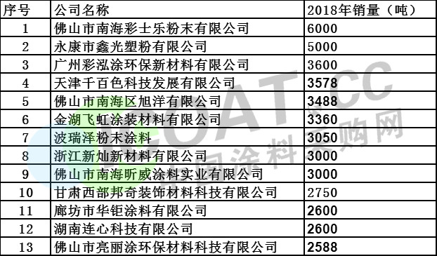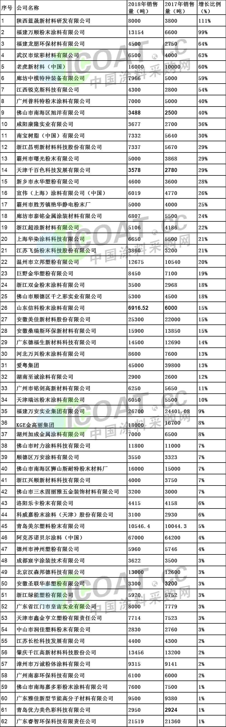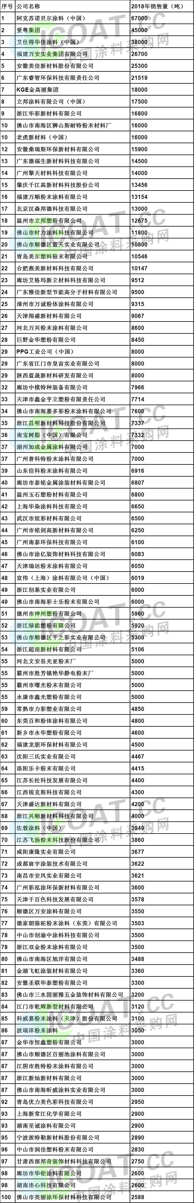 據涂料采購網不完全統計,2018年我國粉末涂料銷量百強企業總銷量為:843770噸,同比增長6.12%,較2017年的增長速度相比有所下滑,具體名單如下: