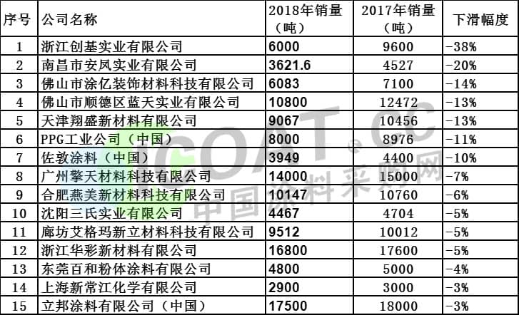 從上表來看,2018年粉末涂料銷量較2017年出現下滑的百強企業共有15家,這一數據較2017年有所收窄,在2017年的粉末涂料百強榜中,下滑的企業數量達23家,最大下滑幅度高達45%,而在本次粉末涂料百強榜中,下滑幅度最大為38%,較去年下滑有所收窄。