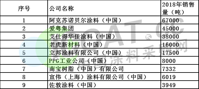 據涂料采購網不完全統計,2018年粉末涂料銷量百強榜中外資企業的總銷量為20.88萬噸,占比24.7%,內資企業的銷量占比75.3%。較上年相比,外資企業的銷量出現小幅下降,阿克蘇諾貝爾、愛粵集團、艾仕得華佳涂料(中國)仍然位居粉末涂料百強榜的前三位。