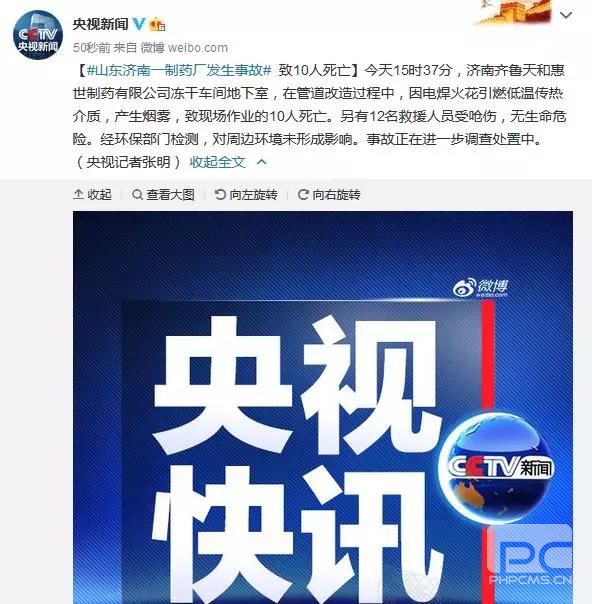 15日15時37分,齊魯天和惠世制藥有限公司凍干車間地下室,在管道改造過程中,因電焊火花引燃低溫傳熱介質產生煙霧,致使現場作業的10名工作人員中8人當場窒息死亡,其余2名工作人員在搶救過程中死亡。另有12名救援人員受嗆傷,無生命危險。