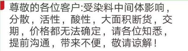 據(jù)涂料采購網(wǎng)了解,受“3.21”化工廠爆炸的影響,染料中間體間苯二胺價格依然在大幅上漲,據(jù)業(yè)內(nèi)人士介紹,間苯二胺目前市場價格已越過15萬元/噸大關,具體漲到多少還要根據(jù)市場需求情況而定。預計近期間苯二胺將會持續(xù)處于高位上漲的狀態(tài)。個別分散染料已經(jīng)斷貨,活性染料部分產(chǎn)品也相對短缺。比如93紫、291藍、紅玉等等目前都已斷貨。