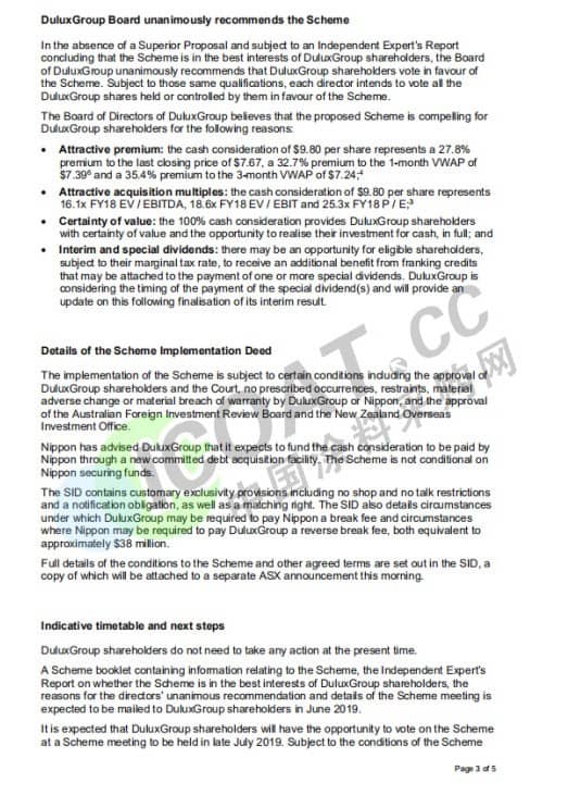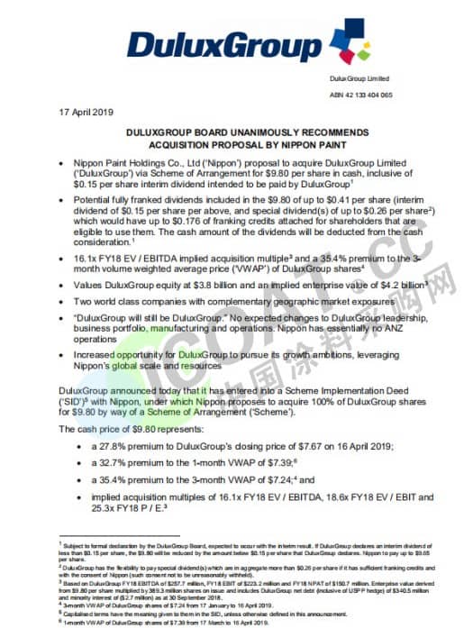 立邦在公告中表示,此次對于澳洲多樂士的收購也是在實現其自身追求全球發展的一次機會,將會增加日本在全球的規模和資源利用。多樂士集團董事長Graeme Liebelt先生說:“董事會已仔細考慮過多樂士集團可提供的戰略選擇,以實現價值最大化,包括繼續追求作為獨立公司的國內和全球增長,我們一致認為與日本的交易符合股東的最佳利益。它提供了一個股東有機會實現股票市值的顯著溢價,并且其條款反映了多樂士集團對日本的戰略價值。日本一直都很欣賞DuluxGroup團隊的能力以及企業的高質量和績效記錄,所有這些都是他們想要維護的。我對此充滿信心,新的合作關系將為兩家公司帶來強大的利益。“