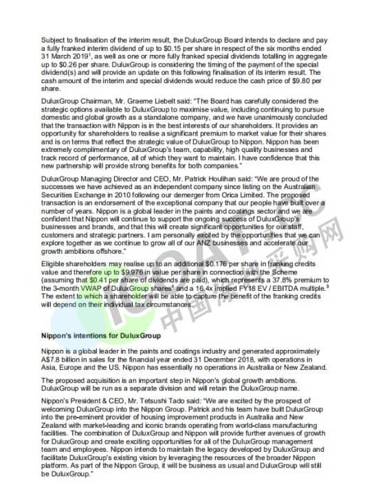 Nippon總裁兼首席執行官Tetsushi Tado先生說:“我們對此次收購感到興奮,歡迎多樂士集團加入日本集團。 Patrick和他的團隊建立了DuluxGroup進入澳大利亞和新西蘭的住房改善產品的卓越供應商,澳洲多樂士擁有市場領先和標志性的品牌,擁有世界一流的制造業務設備。多樂士集團和日本的合并將提供更為廣闊的市場,也將為DuluxGroup團隊和員工以及所有DuluxGroup管理層創造令人興奮的機會。 Nippon打算保留DuluxGroup名稱,促進多樂士集團的現有愿景平臺。作為日本集團的一部分,它將照常營業,DuluxGroup仍將是多樂士集團。”