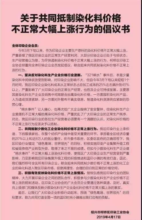 4月17日,因難以承受染化料價格大幅上漲的巨大沖擊,紹興市柯橋區印染工業協會發出倡議書呼吁共同抵制上游企業“不正常”上漲的行為,引發各界高度關注。