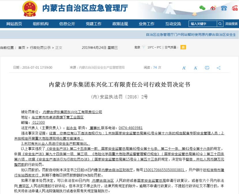 2016年8月,烏蘭察布市政府官網(wǎng)公示,對(duì)東興化工作出2萬元行政處罰,并責(zé)令東興化工對(duì)相關(guān)責(zé)任人予以責(zé)任追究和處罰。